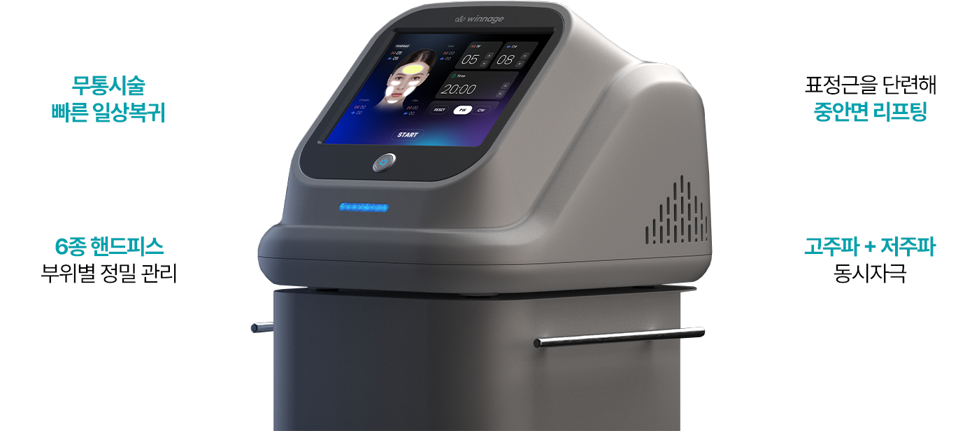 위너지는 고주파(RF)+저주파(EMS) 기반의 복합 리프팅 장비입니다.